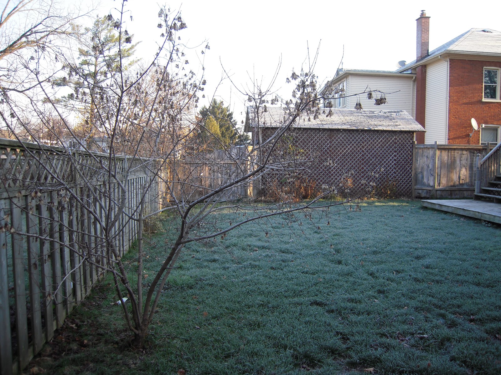 Being an old neighborhood, property divisions are a bit wonky and there are portions of the yard that are fenced, and other portions where neighboring sheds/garages act as a fence. In fact our garage is what separates us from one neighbor and if you peek through one of the garage windows you are practically staring into their back door!