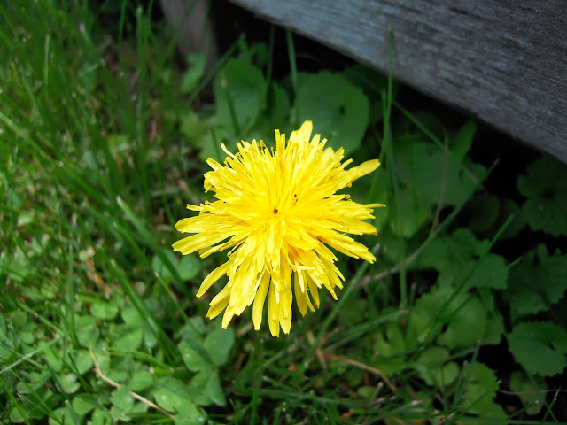 Hostas have been popping up in the front and back yard like Dandelions! I don't mind though, they are one of my favorite plants, they just get big and green and leafy and I LOVE them! Oh, and of course, a Dandelion! I did a number digging weeds out of the lawn and I can't believe it but with the exception of this lone lion, none have popped back up to haunt me (like weeds so often do).