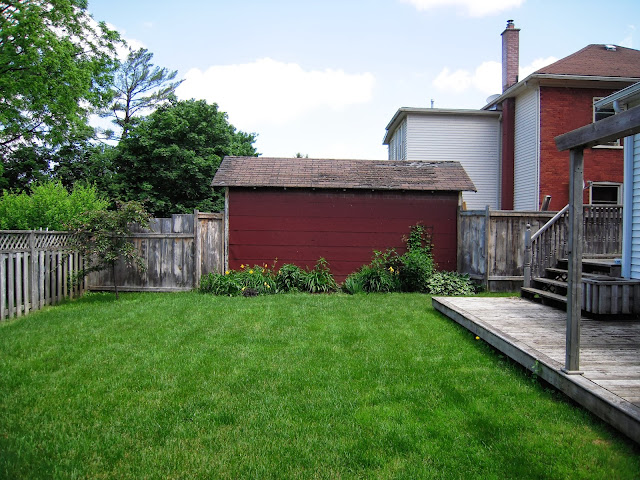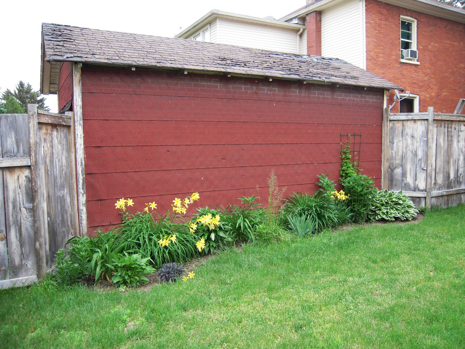 The first two photos were taken about 3 weeks ago. The yard is much neater than it was lat year when we moved in and the lawn is healthy and green, not dead and brown like last summer! A good amount of flowers/mystery plants came up in the flower bed next to the shed. I spent quite a bit of time pulling out stuff that I thought were weeds and rubbish almost two months ago, it is wonderful to see what has survived!