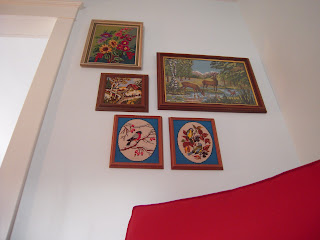 Needle point artwork - I don't know why this started, but over the past 6 months I have collected a number of framed needle point pictures. There are two recent additions not yet up on wall, and I may welcome a couple more home if I find any worthy of holding their own next to the deer family!