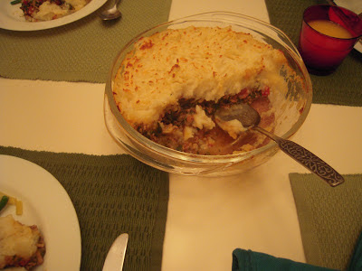 To repay my mum for Saturday night's dinner, I made dinner Sunday. An invention of sorts, influenced by one of my favorites, Sheppard's Pie! It was a success, but didn't photograph well.