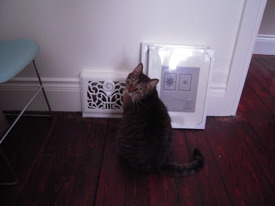 On cold, snowy days like this, Buster splits his time between sleeping on one of the many cozy, blanket-covered chairs/couch and sitting in front of the heating vents! This cat is not stupid, he caught on fast that there are these "holes" in the wall that blow warm air! He is staring at me in this photo because the heat just clicked off...like I had something to do with it!