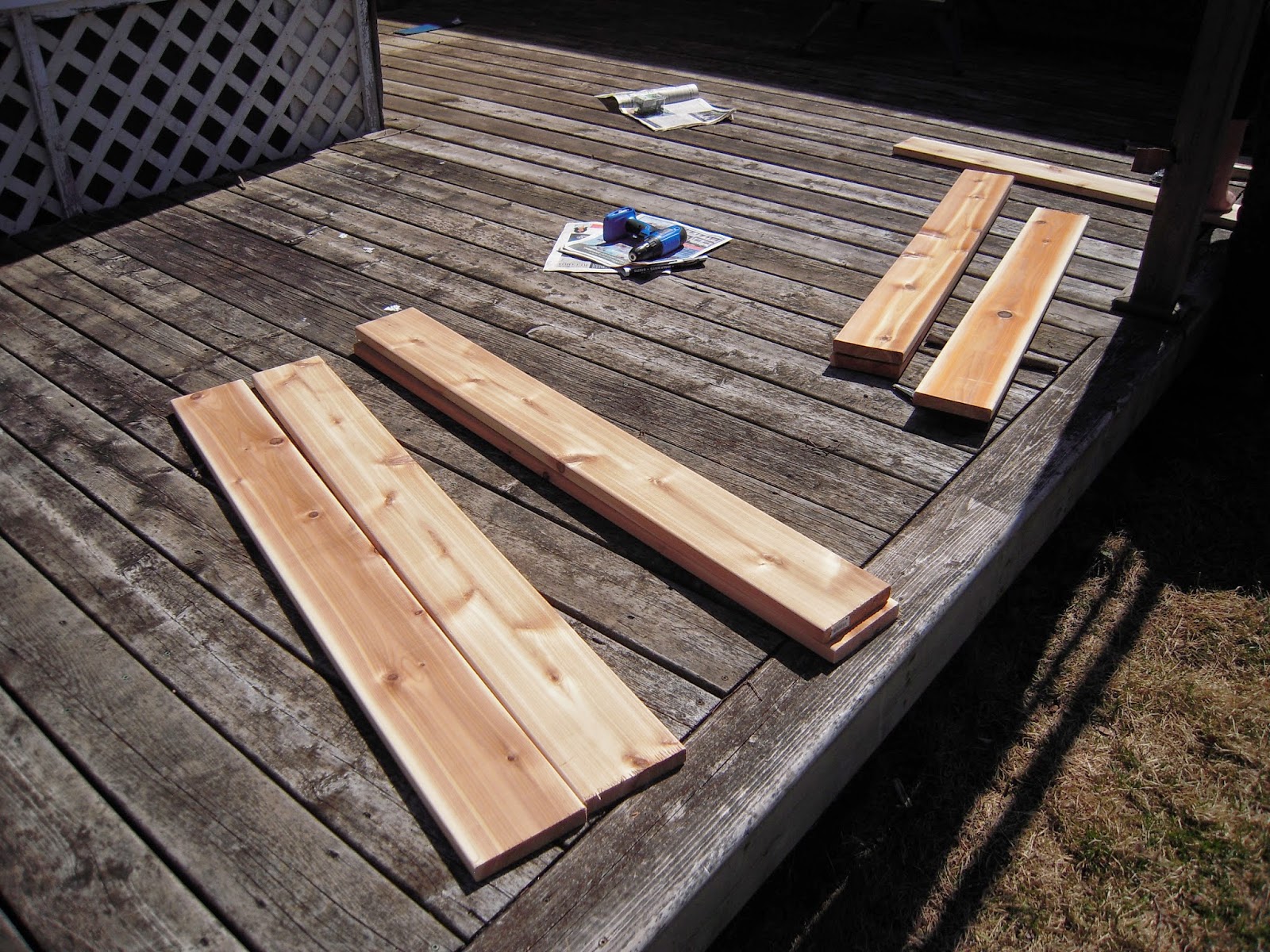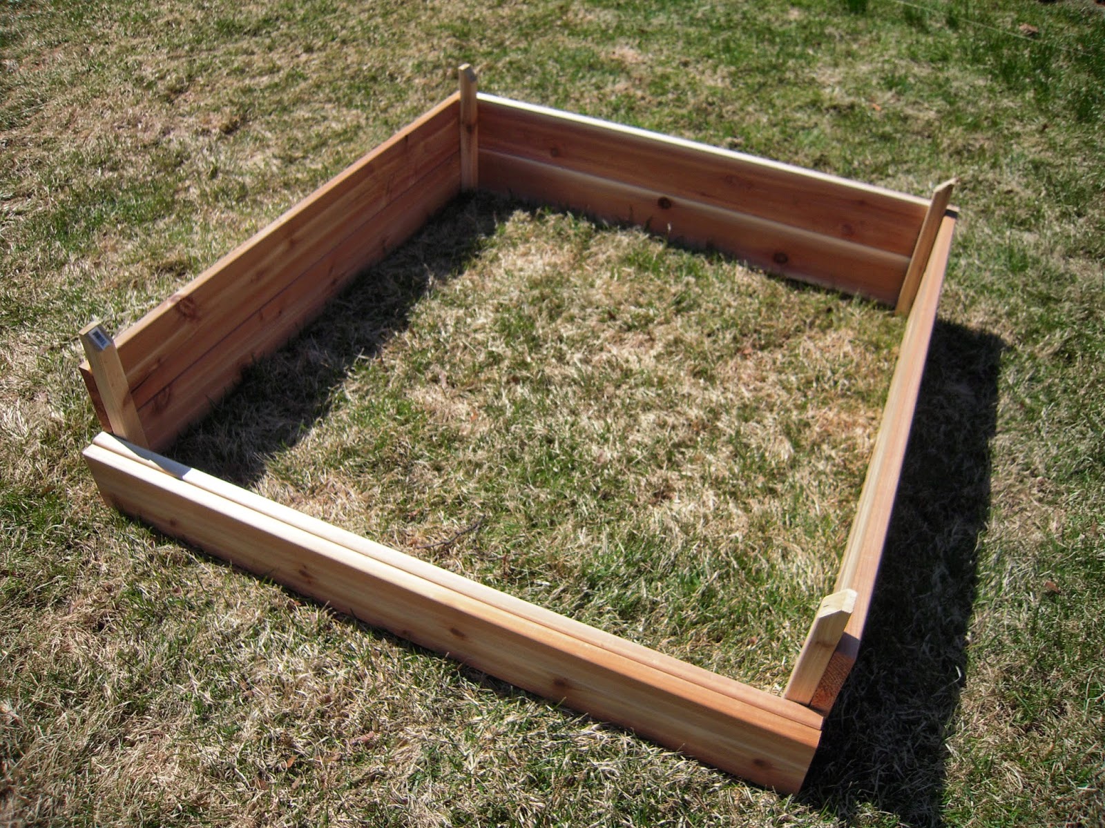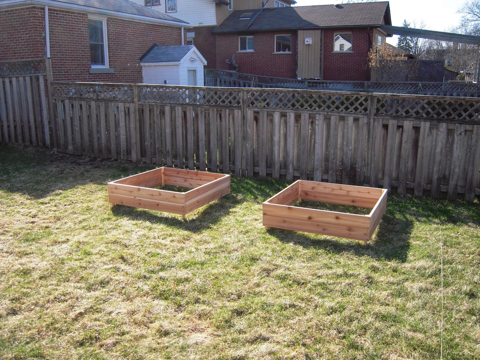 The beds are made of cedar (rot resistant and not treated with nasty chemicals) and are each 4' by 4' square. I plan on surrounding the beds with mulch and hopefully making a neat stone or brick boarder against the surrounding lawn. Once the other two beds are made I can give you a better idea of how much the beds cost to make - not the cheapest because of our choice of wood, but not too outrageous and since this is the first year things are going to be more costly, we are starting from scratch after all. The biggest challenge (as I see it) will be finding the right blend of soil to fill the beds. I know it's my first year and I can't expect 100% success, but I hope to get things off to a decent start with the right mix of soil, so a little research is needed.